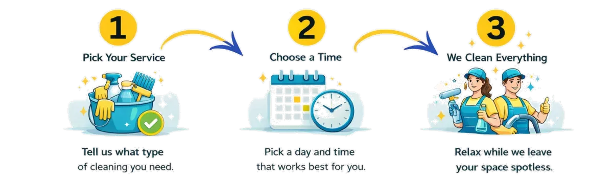 Getting your home or office cleaned should be easy, not complicated. Our process is designed to save you time, reduce stress, and deliver reliable results you can count on with every visit.